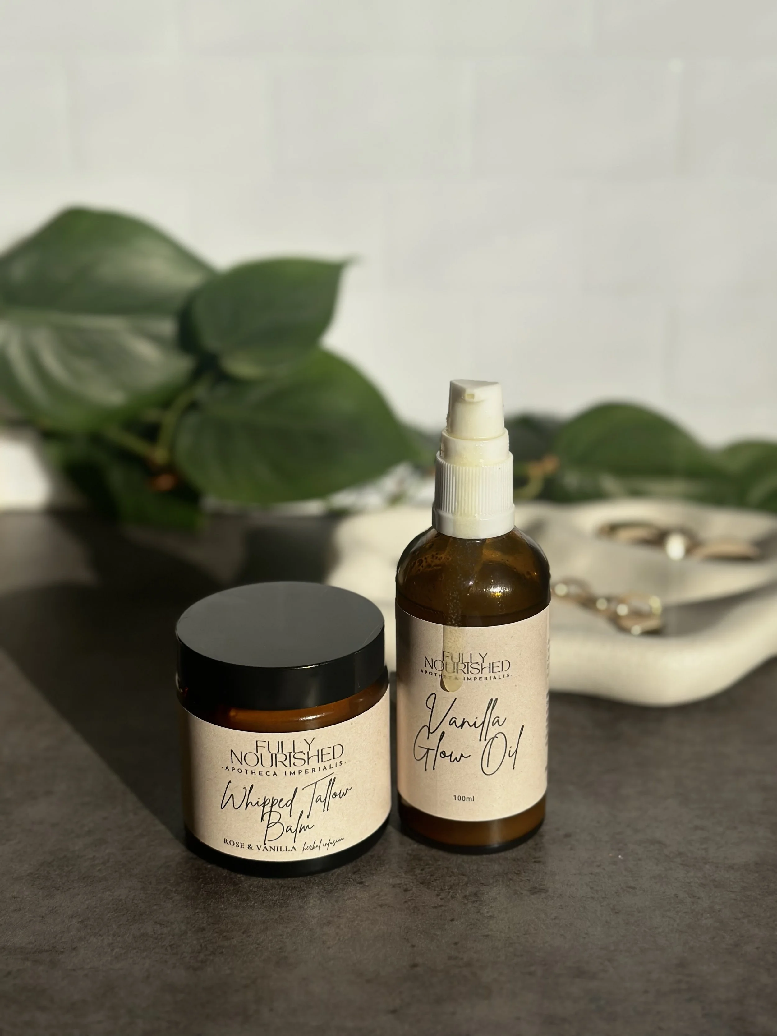Vanilla Glow Oil – tallow, emu oil and jojoba oil glow serum infused with vanilla beans and vitamin e.