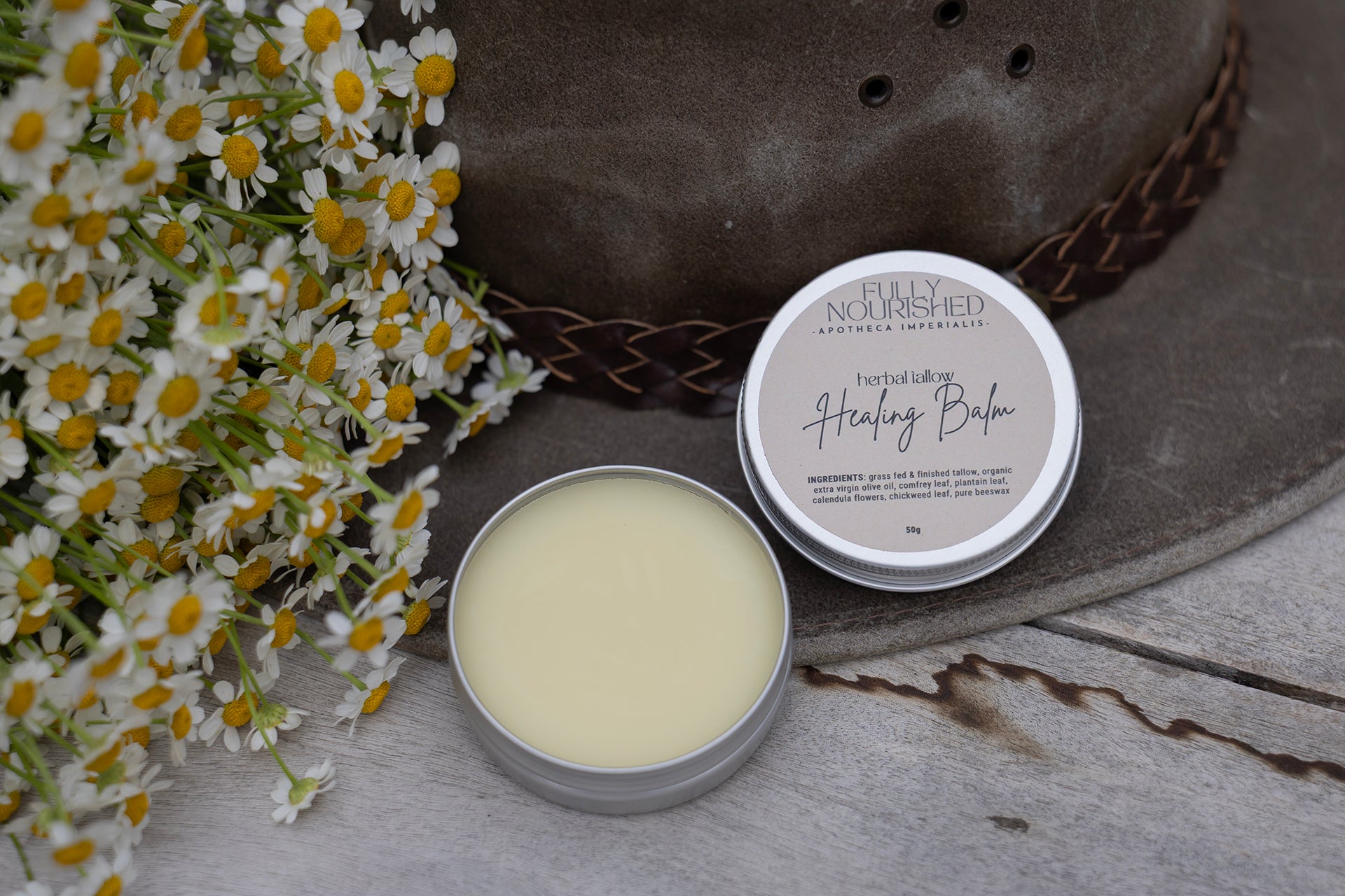 Crafted with care, each tin is packed with skin-loving ingredients including grass-fed and finished tallow, organic extra virgin olive oil, comfrey leaf, plantain leaf, calendula flowers, chickweed leaf, and pure beeswax.